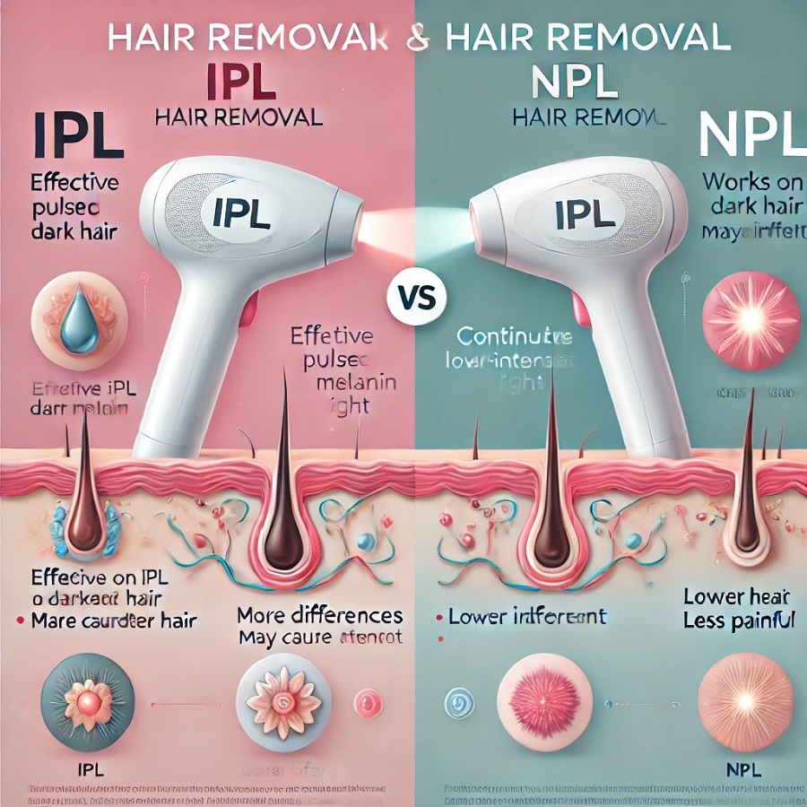 IPL脱毛は広範囲の波長の光を利用し、メラニンに反応することで毛根にダメージを与える方法です。一方、NPL脱毛は進化した光脱毛技術で、より低温で連続的に光を照射することで肌にやさしく、痛みを抑えながら脱毛を進めることができます。