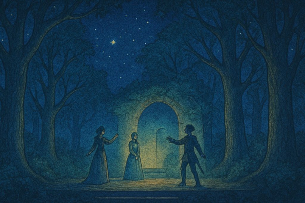 『夏の夜の夢』では、妖精たちのいたずらによって人々の愛や思いが混乱しますが、神社のシーンでも同様に、人間関係が錯綜し始めます。
