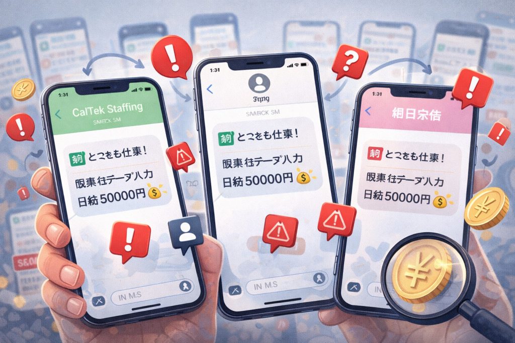 実際に、「MSH Talent Solutions」や「CalTek Staffing(カルテック・スタッフィング)」を名乗る求人メッセージについては、同じような文面や条件が複数確認されており、注意が必要だと感じる人が増えています。