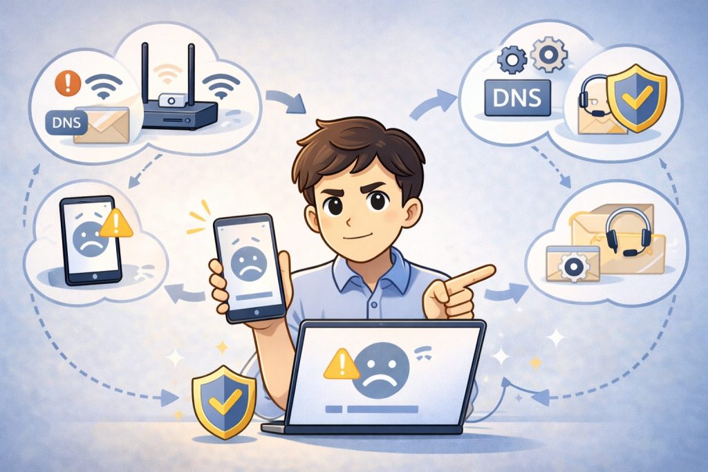 DNSという言葉は少し難しく見えますが、ざっくり言うとサイトの住所を正しく探せていない状態です。
