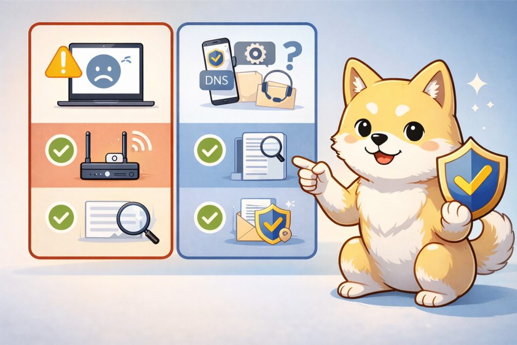 とくにスマホは通信切り替えやブラウザ設定、PCは拡張機能やセキュリティ設定の影響を受けやすいです。